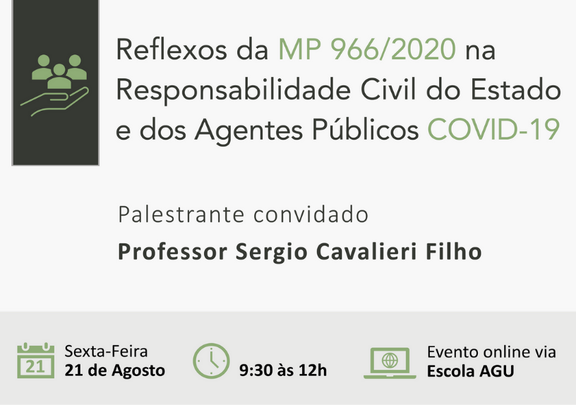 Na próxima sexta-feira, dia 21 de Agosto, das 9:30 às 12 horas, a Escola da Advocacia Geral da União promoverá, através do Youtube, a Palestra Reflexos da MP 966/2020 na Responsabilidade Civil do Estado.